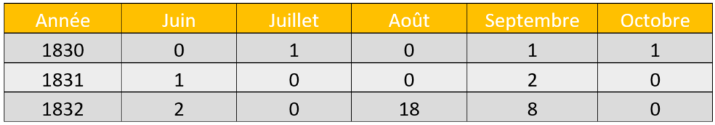 Difficile de connaître la cause exacte des décès et le choléra n’est sans doute pas responsable de tous les cas. Pour août et septembre, cinq nourrissons, un enfant et vingt adultes perdent la vie. En mettant en regard les années 1830 et 1831, la surmortalité de 1832 ne fait malheureusement aucun doute.