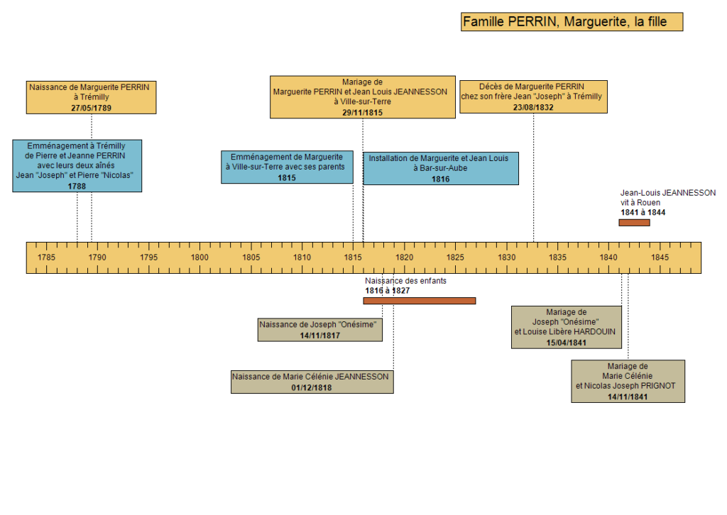Je sais que Marguerite PERRIN (1789-1832) quitte Ville-sur-Terre pour Trémilly. A quel moment ? Est-elle déjà malade quand elle se rend chez son frère Jean « Joseph » ? Emmène-t-elle ses enfants ? Restent-ils avec leur grand-mère Jeanne BULARD (1761-1832) ? Impossible de le savoir. D’ailleurs les éléments que j’ai pu regrouper de la vie de Marguerite sont peu nombreux.