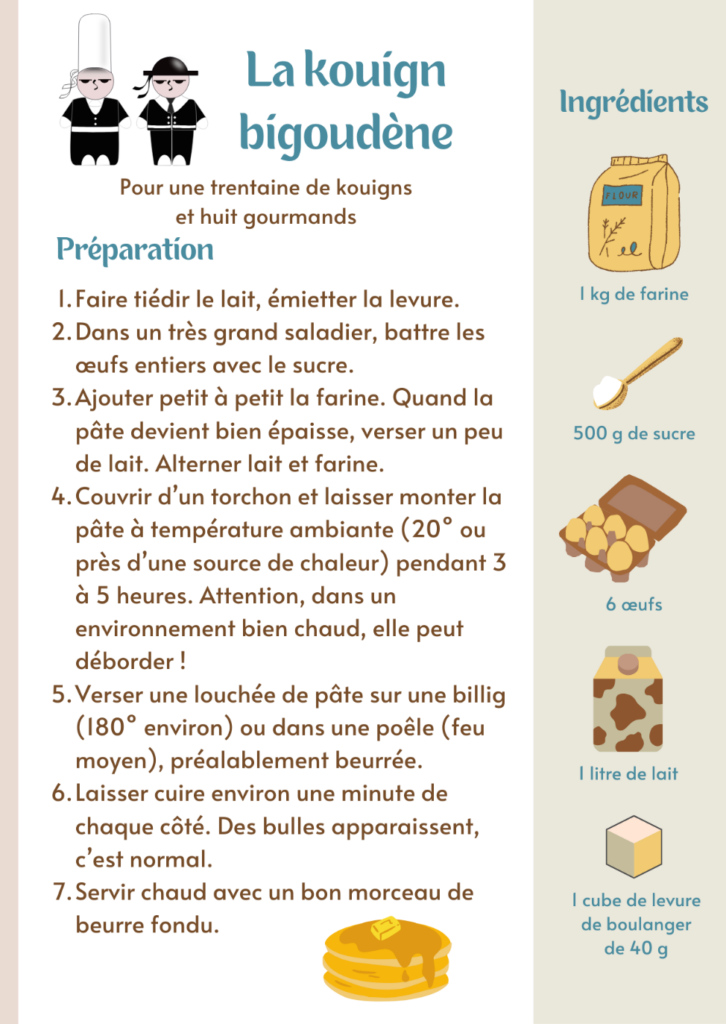 Camille brandit un vieux torchon aux couleurs un peu passées. Au centre, une recette est encadrée de motifs bretons : des personnages coiffés de chapeaux ronds tiennent une galette sablée presque aussi grande qu’eux. Le titre, en lettres bleues, annonce fièrement :
