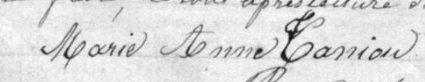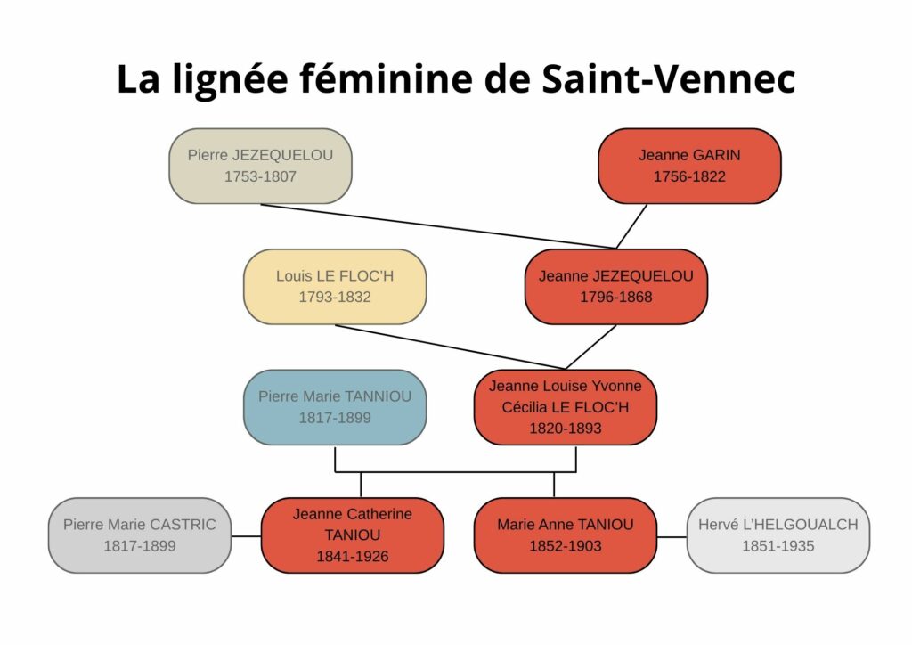 La première femme à laquelle je me suis intéressée est Jeanne Garin, épouse de Pierre Jézéquélou. C’est elle qui reprend la tenure de Saint‑Vennec, où elle décède en octobre 1822. En suivant sa lignée féminine jusqu’à deux de ses arrière‑petites‑filles, Jeanne Catherine et Marie Anne Taniou, un constat s’impose : pendant quatre générations, une seule jeune mariée de Saint‑Vennec signe son acte de mariage.